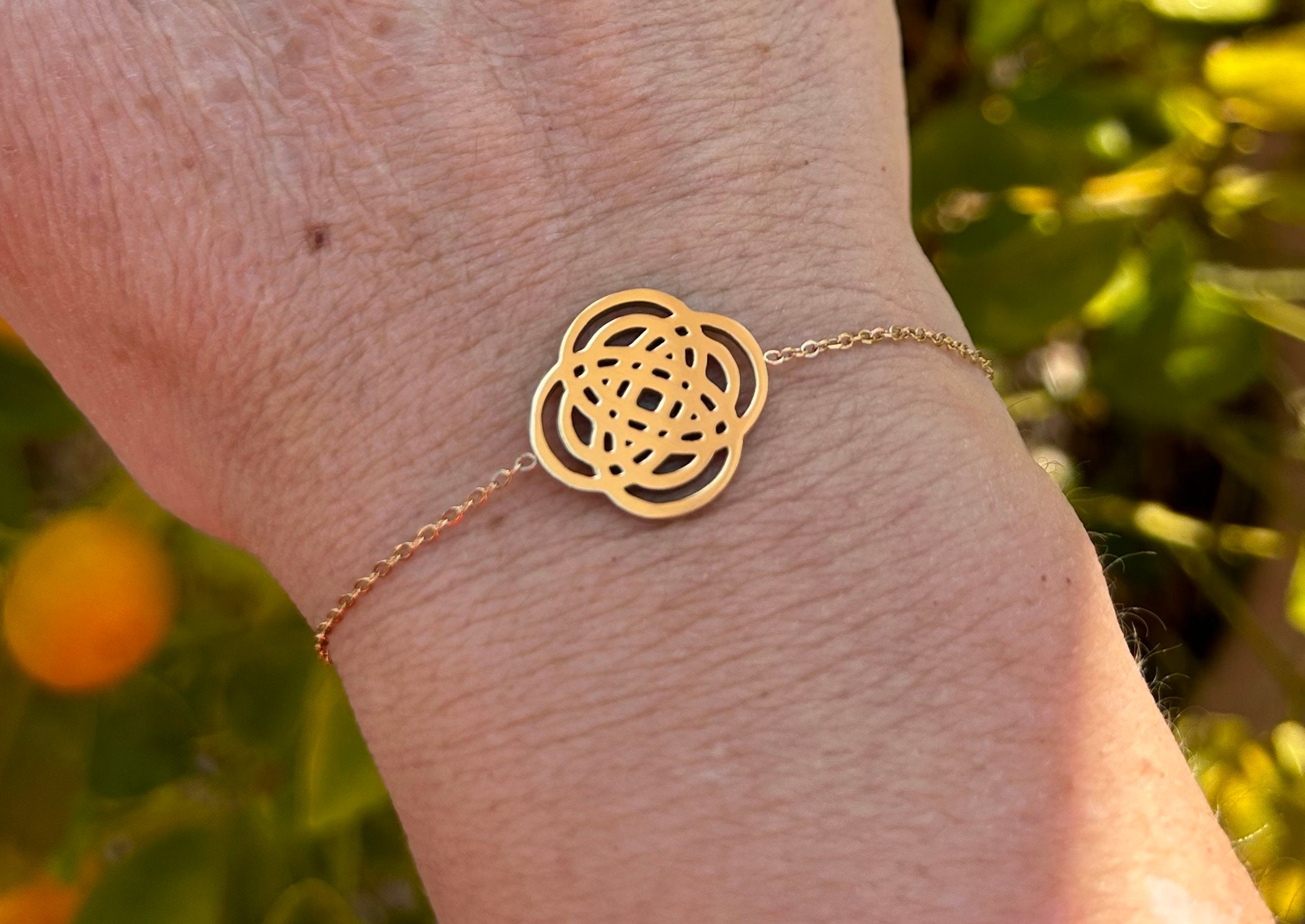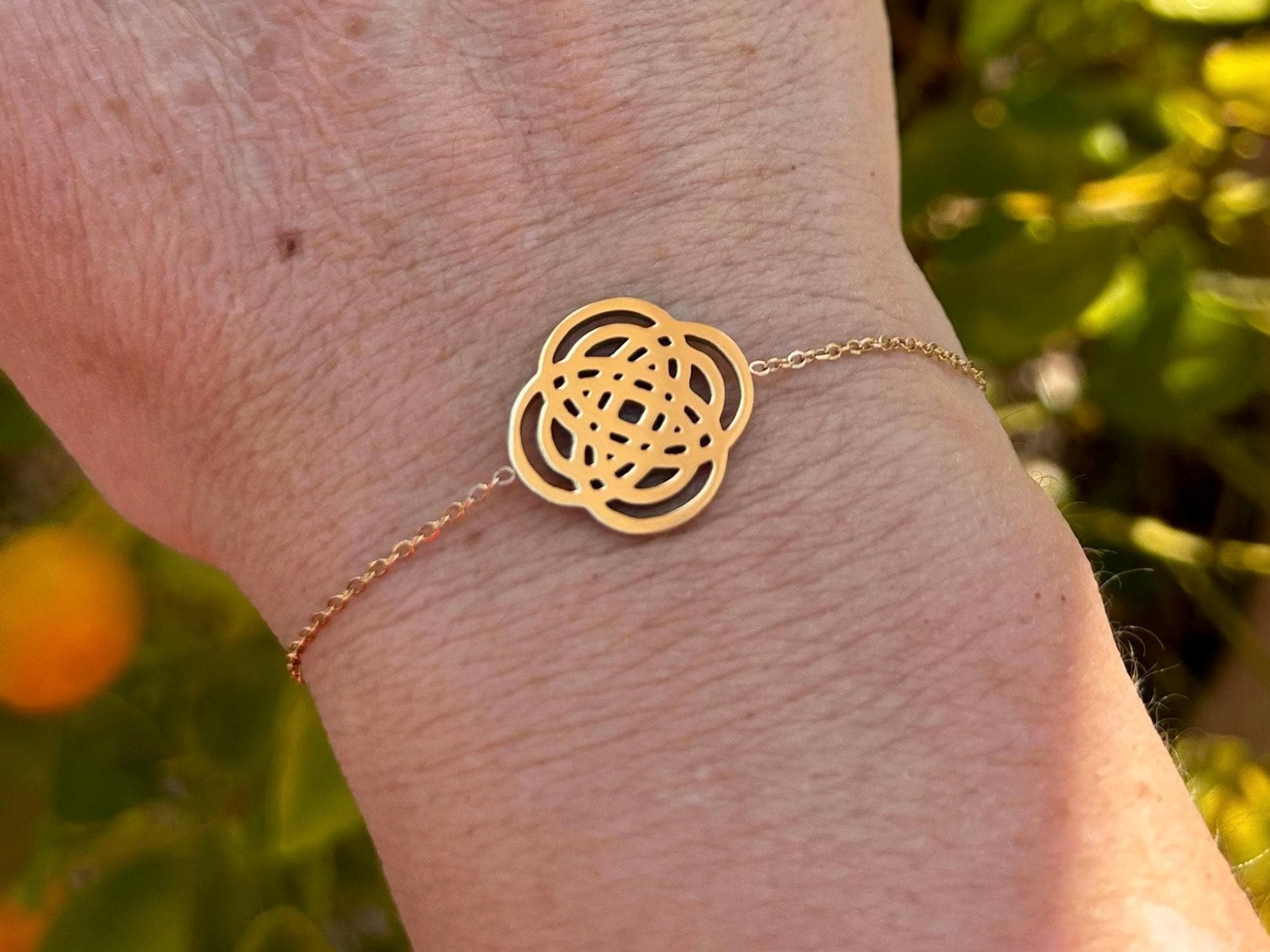 Round gold-plated clover bracelet in a floral style, delicate, elegant, and timeless jewelry, ideal Christmas gift for women, nieces, cousins, and teenagers.