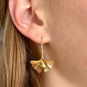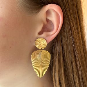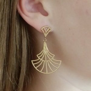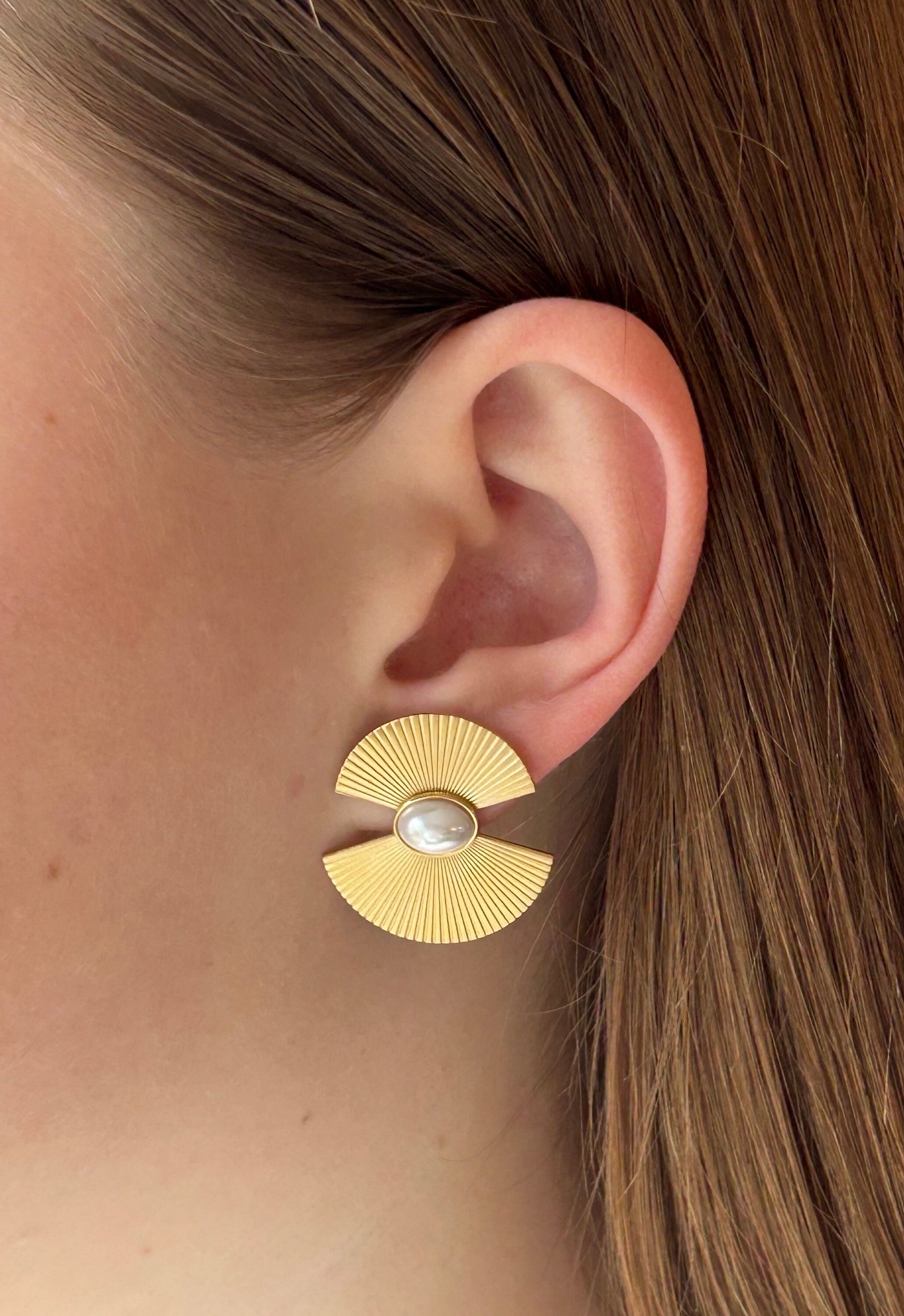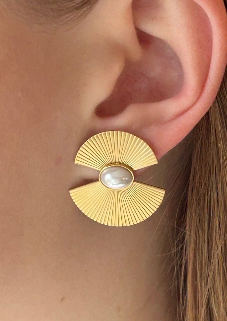 Beautiful gold-tone earrings with a white pearl and fan shape, a perfect gift idea for a birthday or a treat for yourself. Fast shipping.