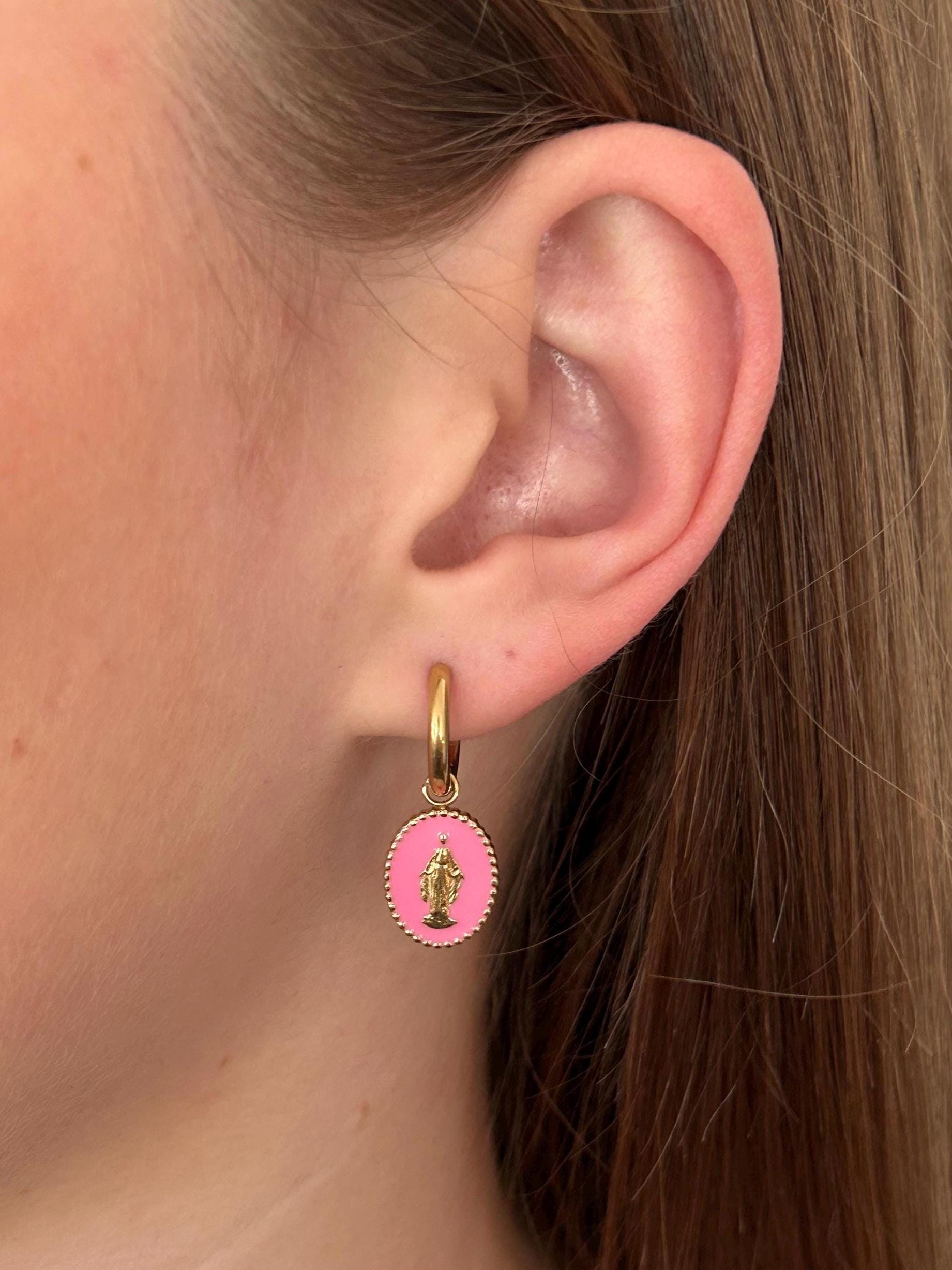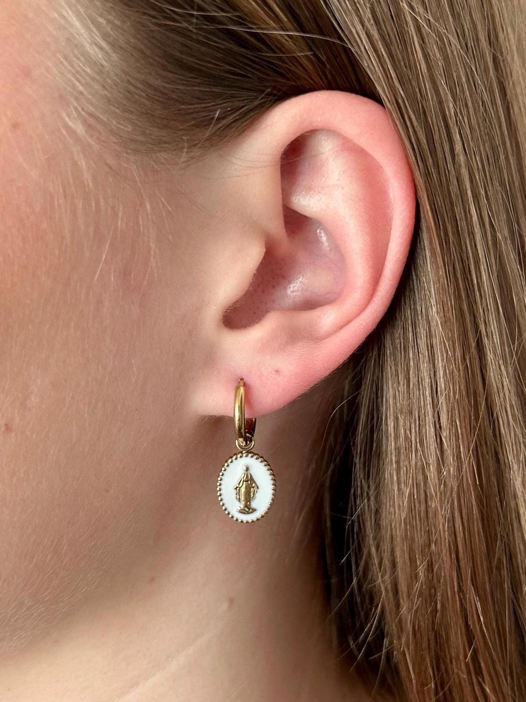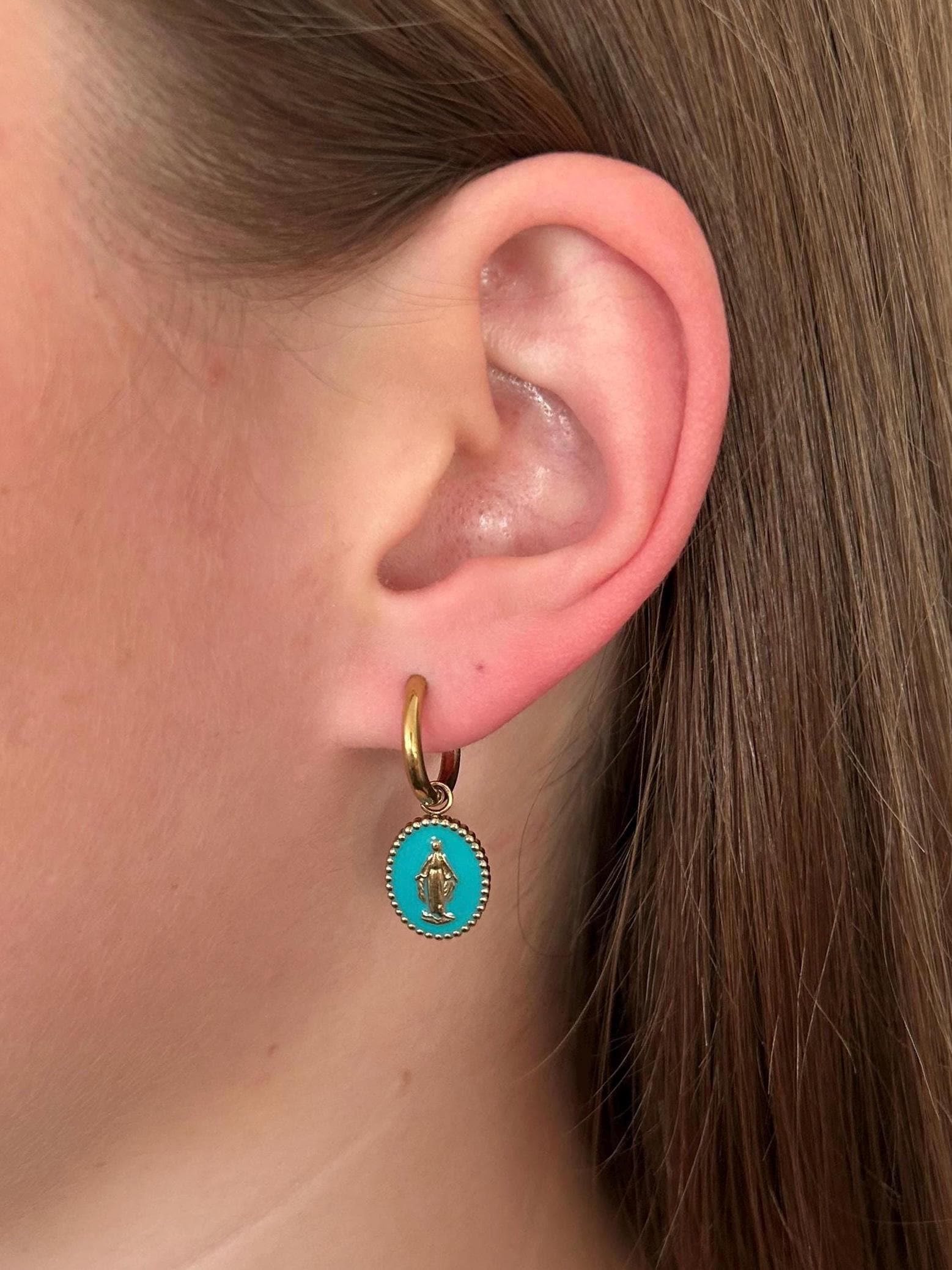 Pretty round hoop earrings with a beautiful medal of Mary, the Miraculous Virgin, in gold, white, rose gold, or blue. Trendy and lightweight, they're perfect for everyday wear. A wonderful gift idea for a young woman, girl, or teenager this Christmas. Gift box included.