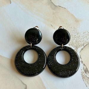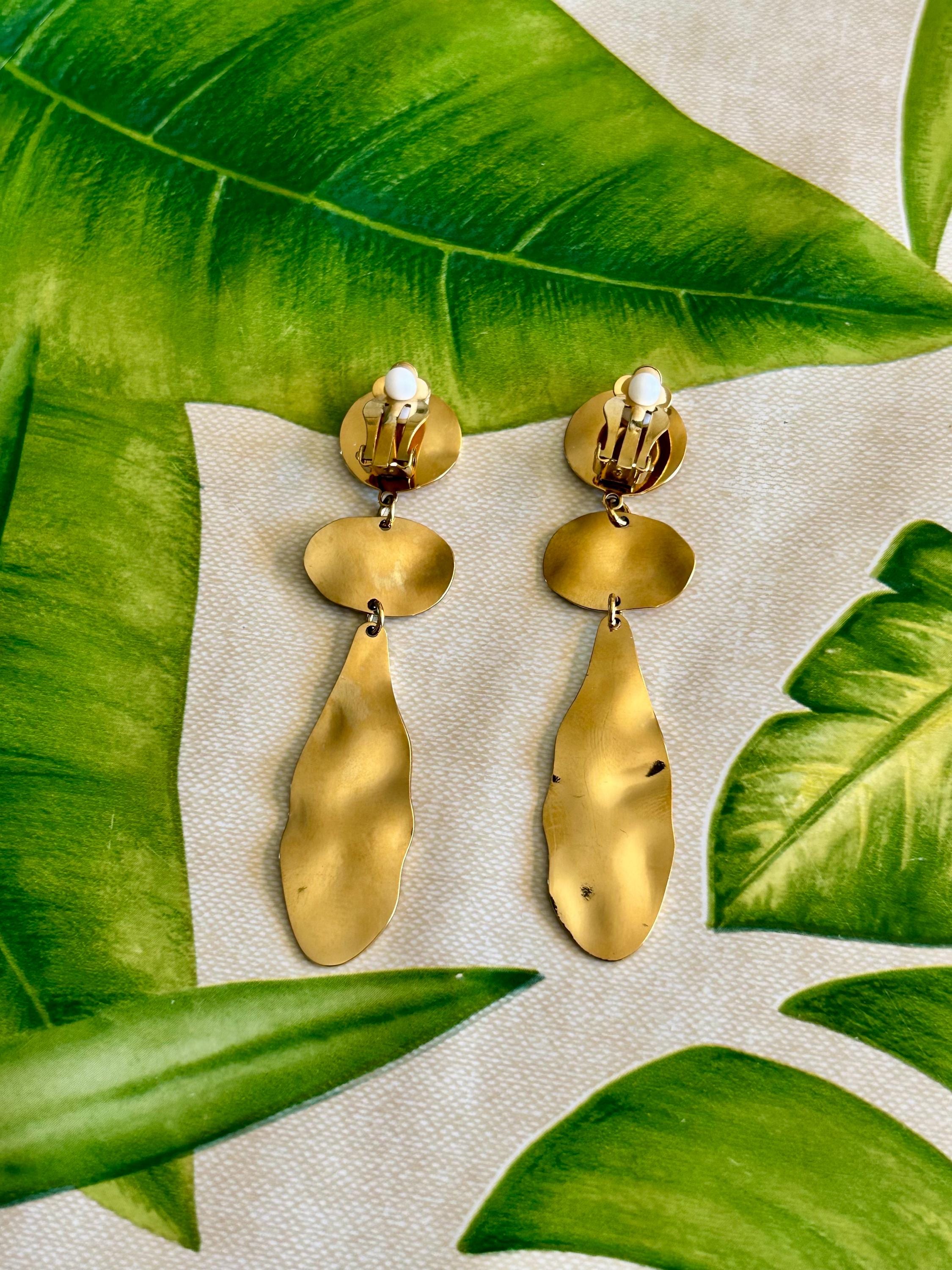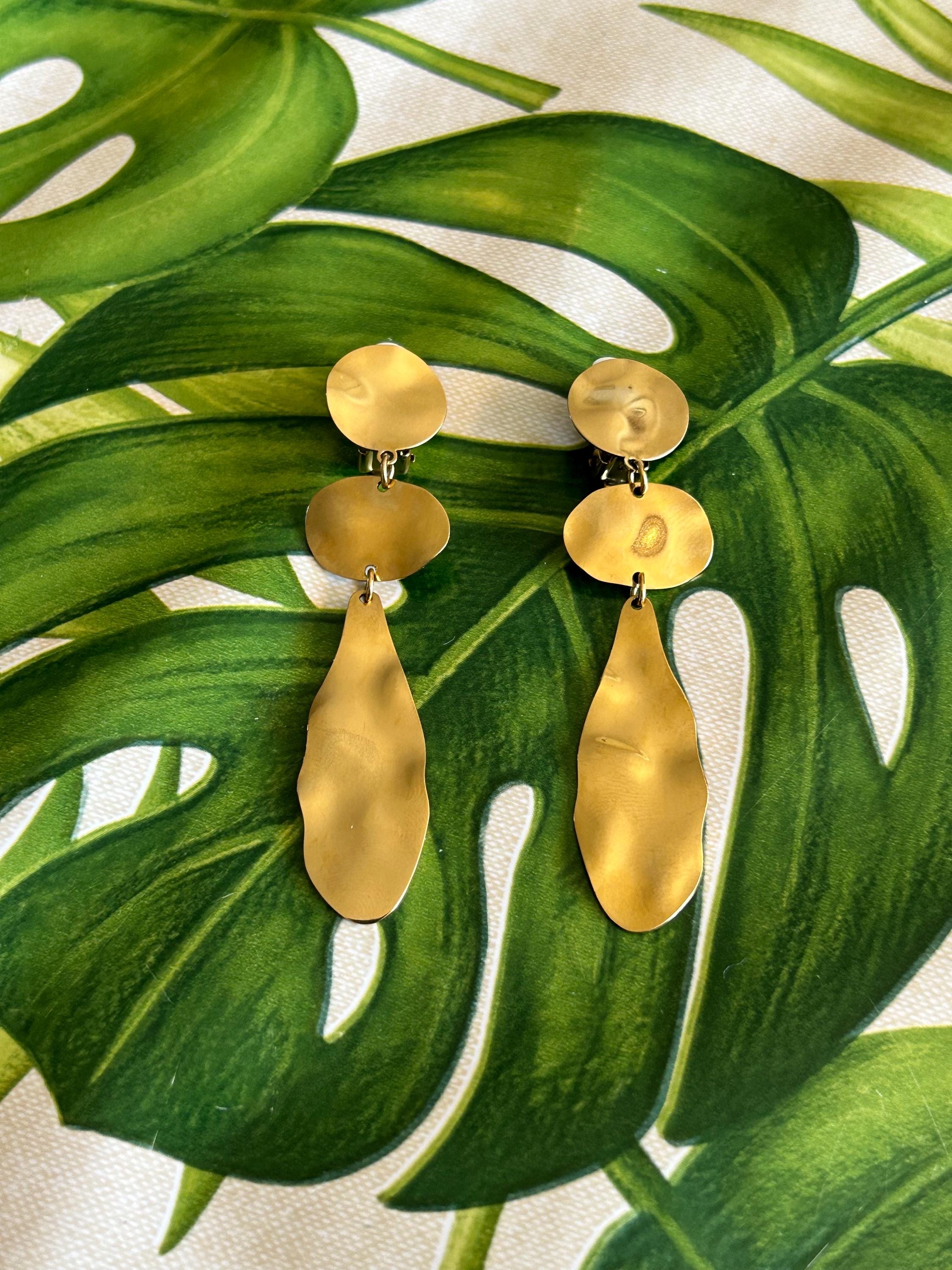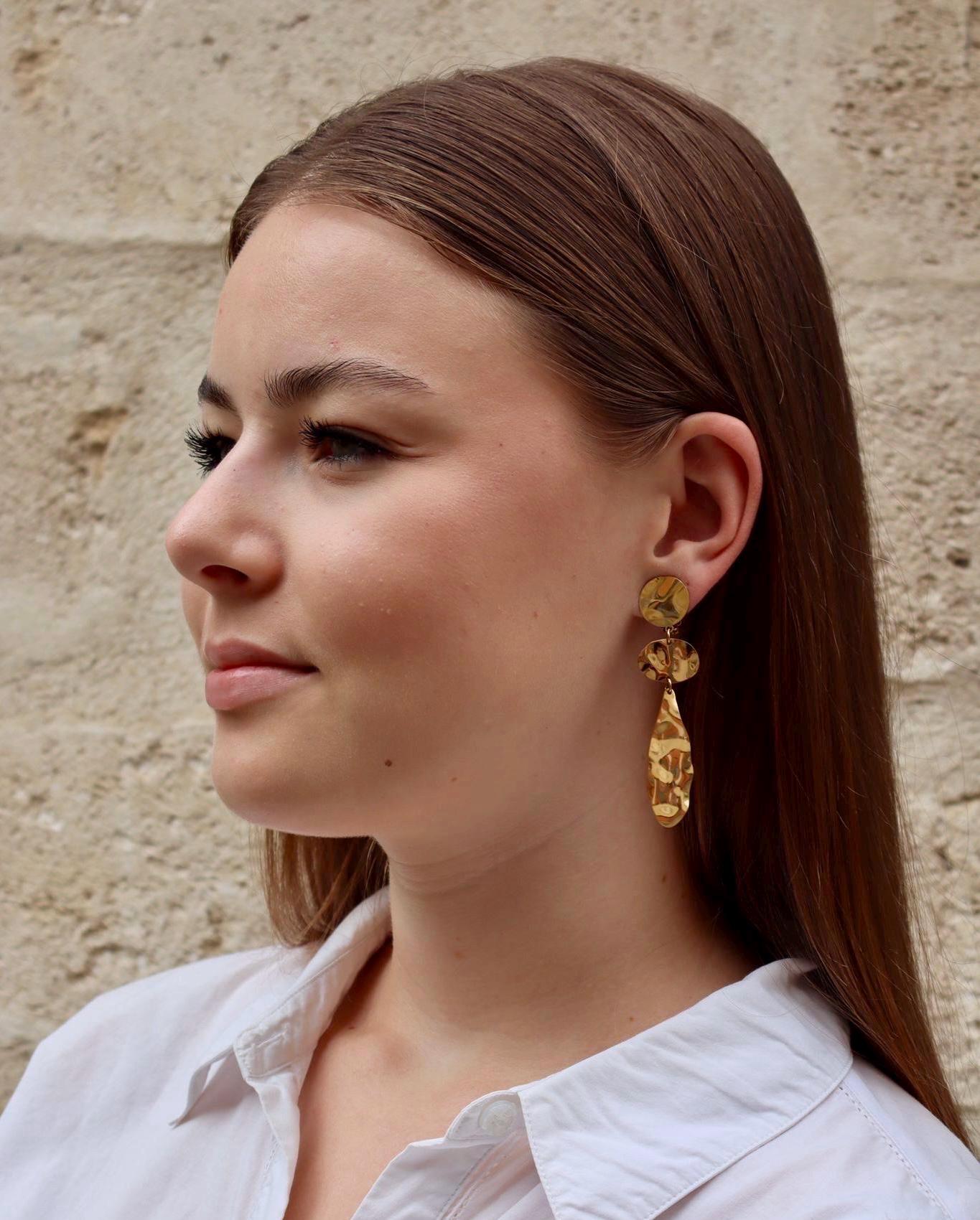 Earrings made up of 3 elements: 1 round, 1 oval, 1 long drop, comfortable to wear, light. Length: 7 cm, width 1.5 cm for the round part on the ear with the clip.