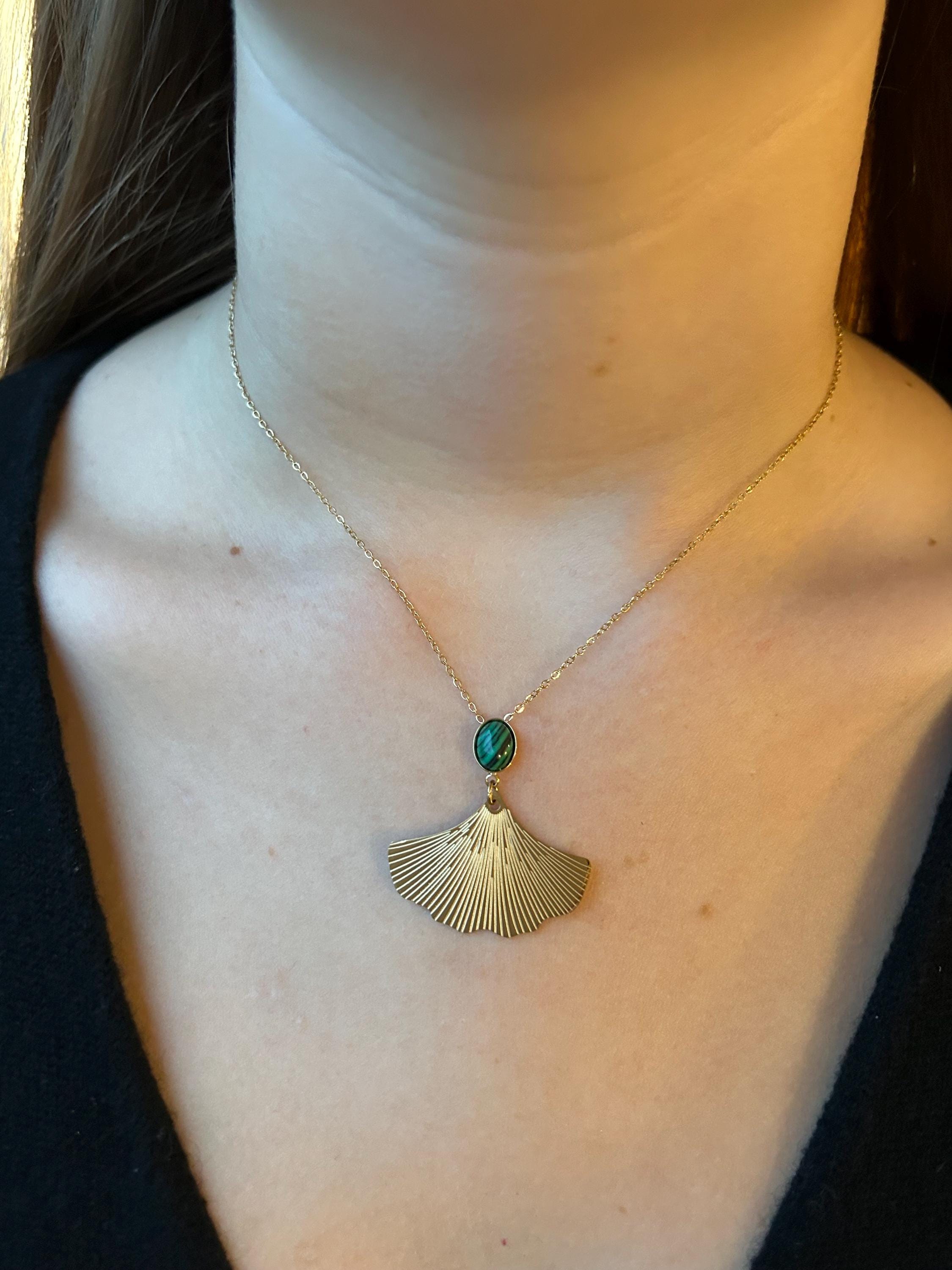 Longueur totale du pendentif : 3,5 cm incluant la pierre ovale de 1 cm de long et le pendentif Gingko biloba : 2,5 cm