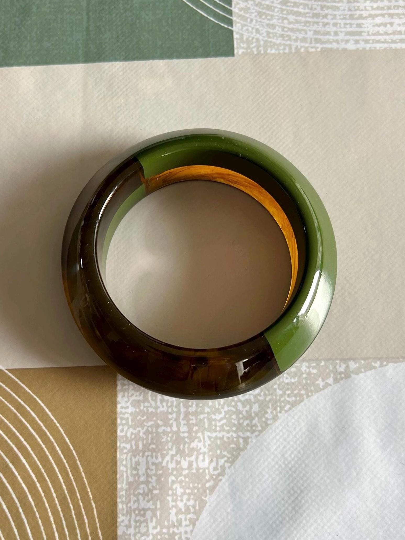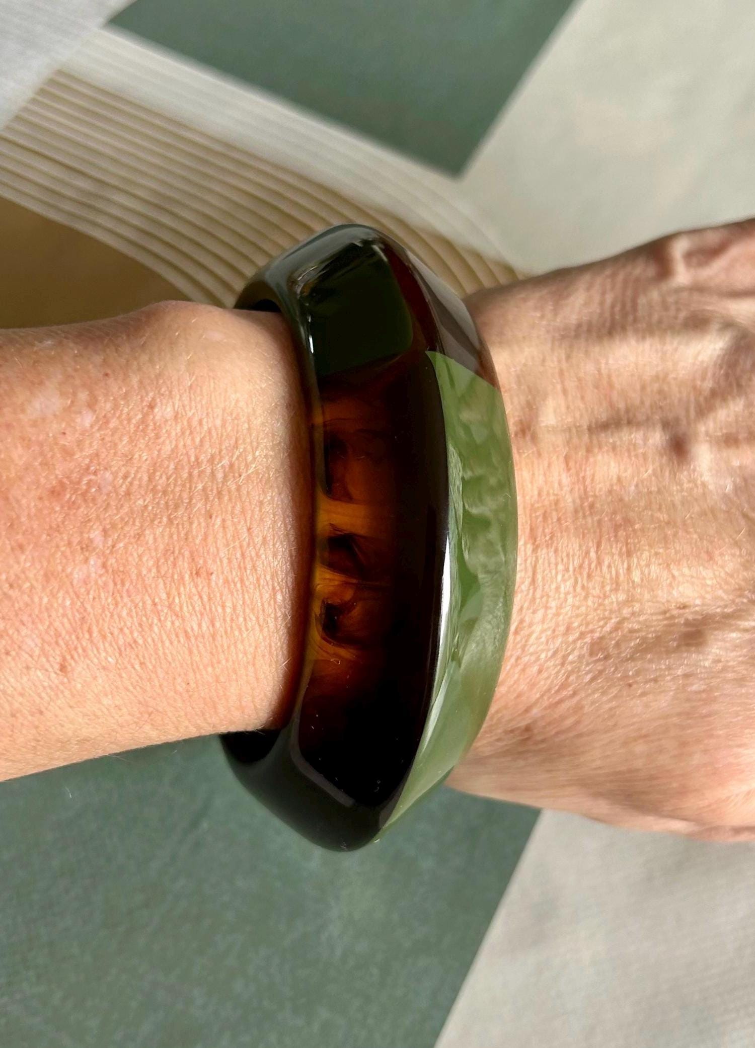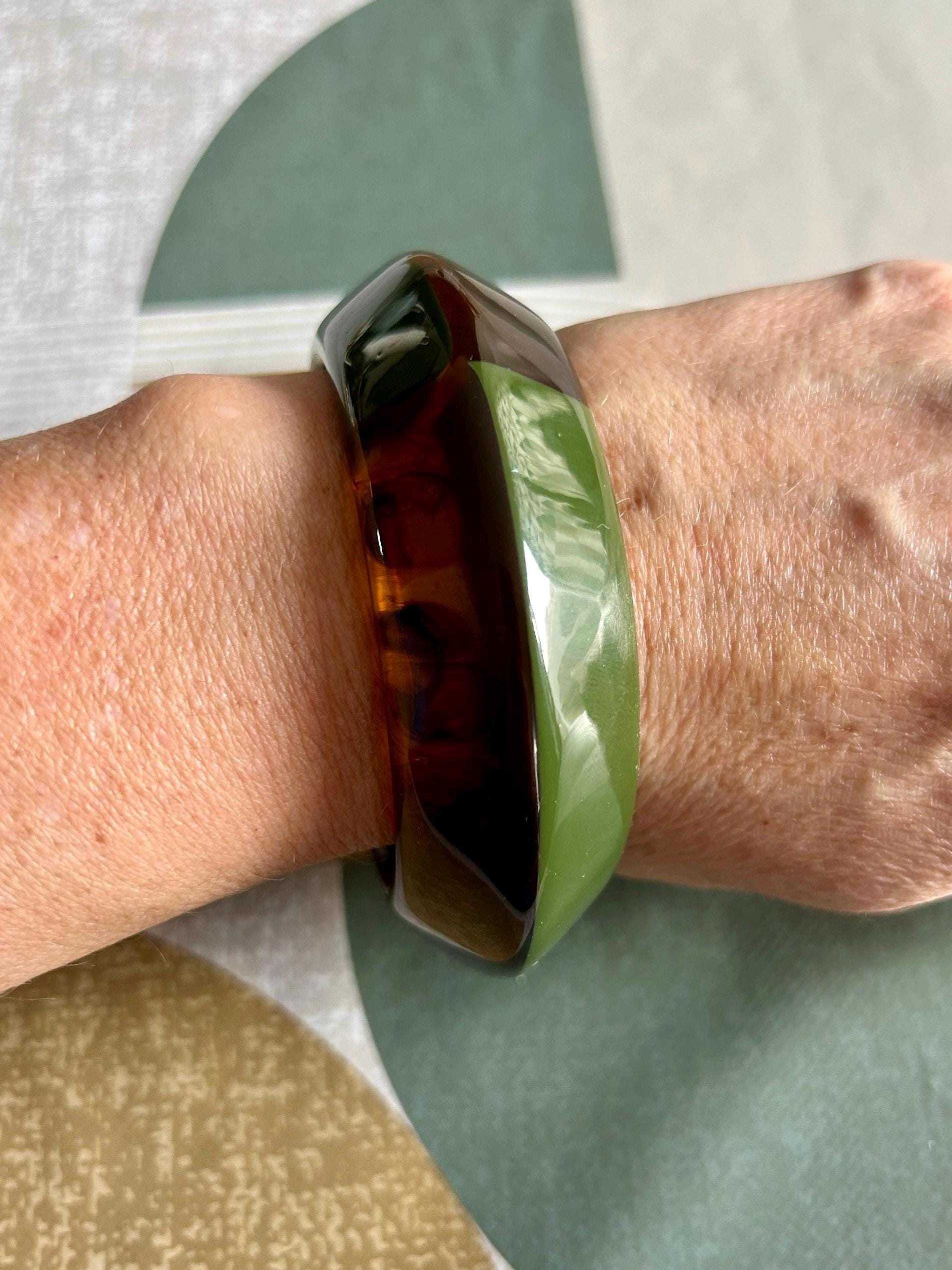 Pretty wide asymmetrical bangle bracelet, vintage style, in bakelite, brown and green
