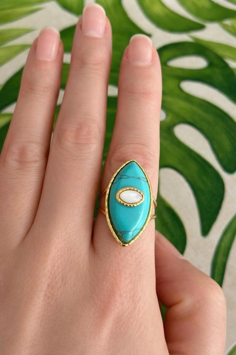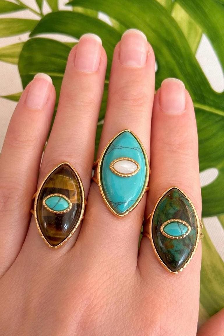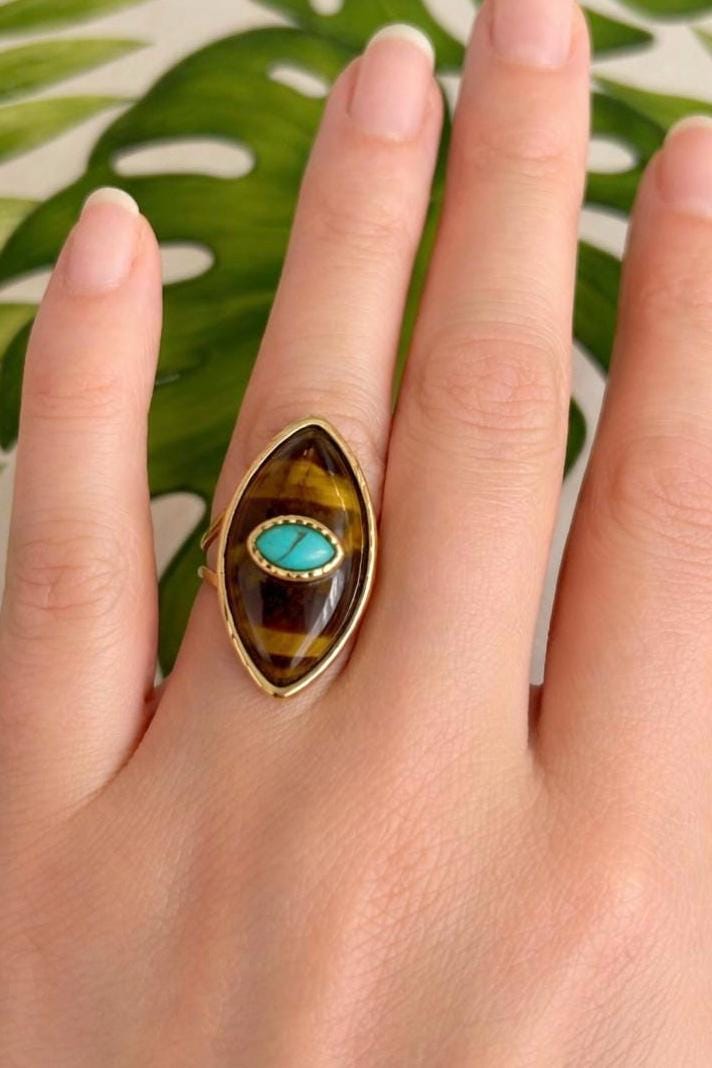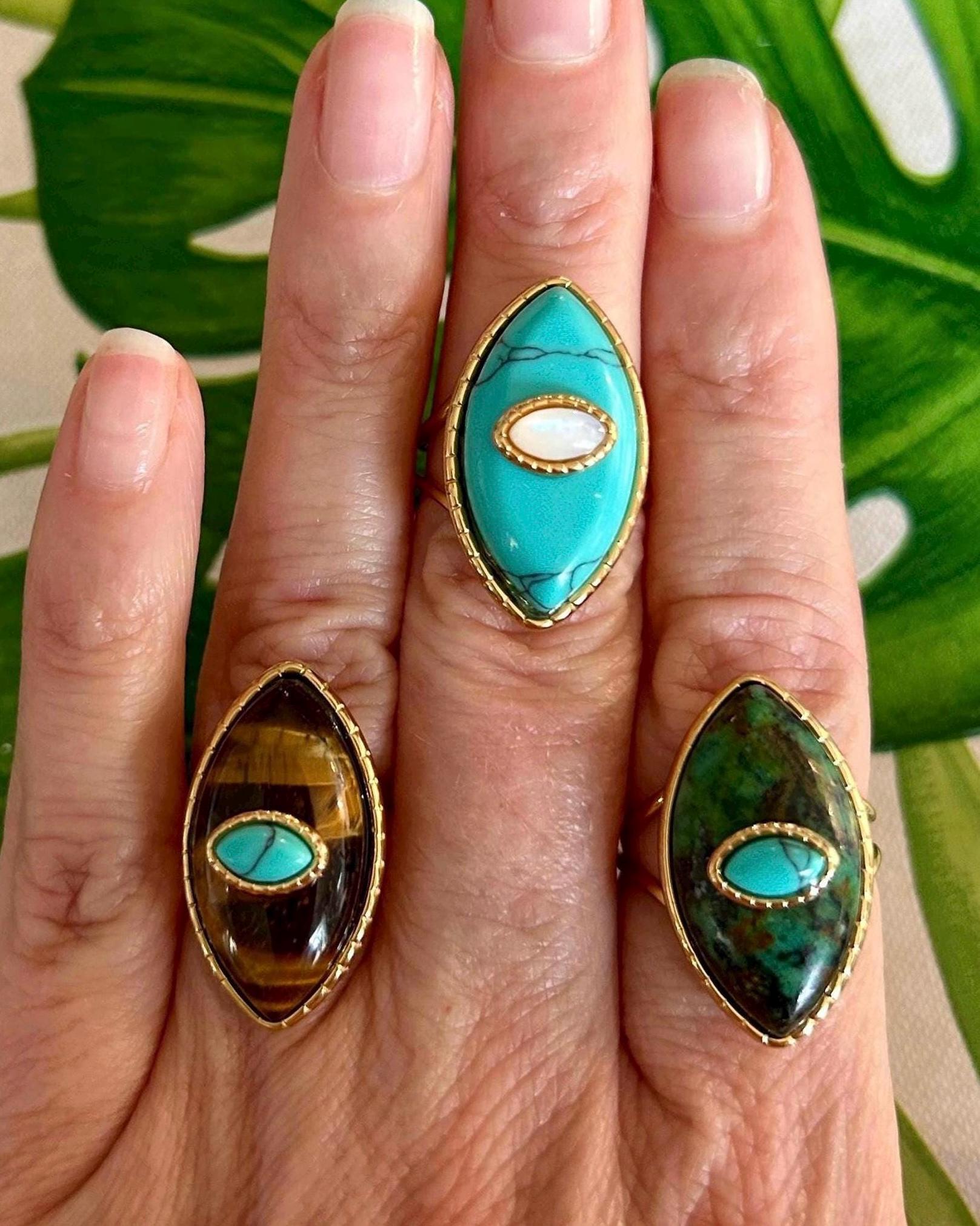 Stunning oval ring, boho chic style, high quality, featuring a natural stone: turquoise and mother-of-pearl, tiger's eye and turquoise, or jade and turquoise. It would make a beautiful gift for a birthday or a treat for yourself.