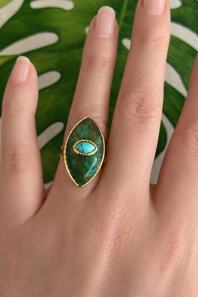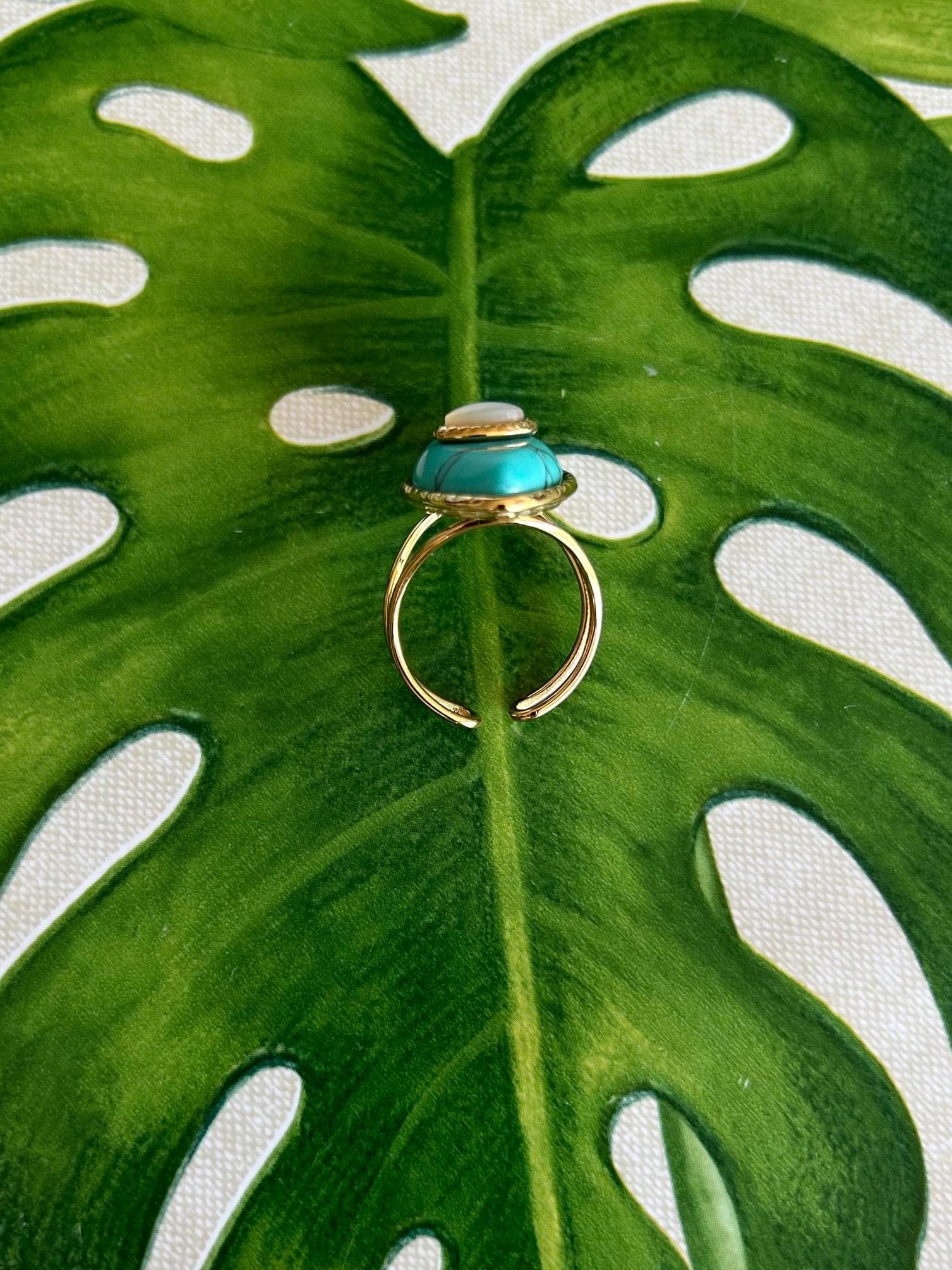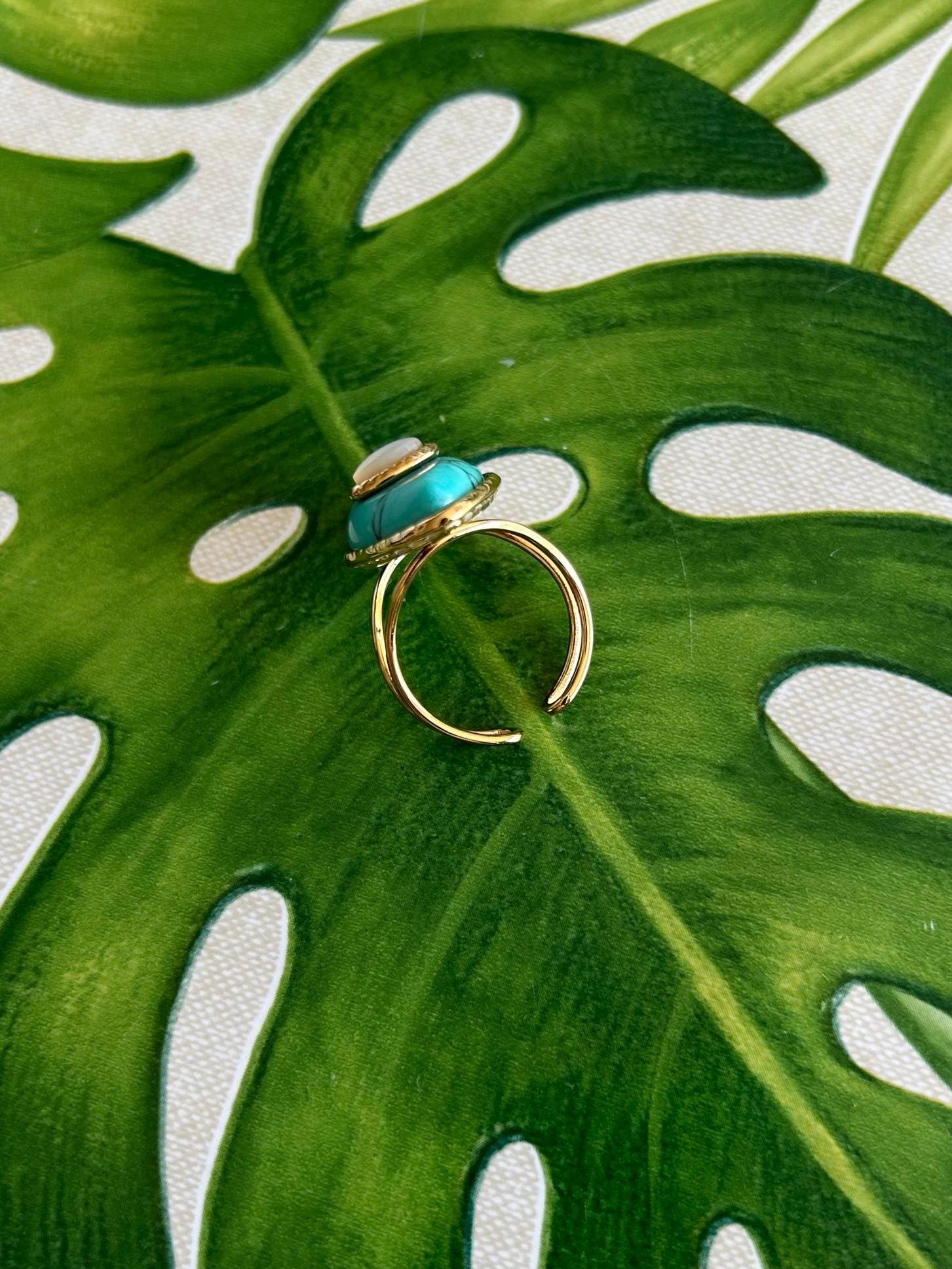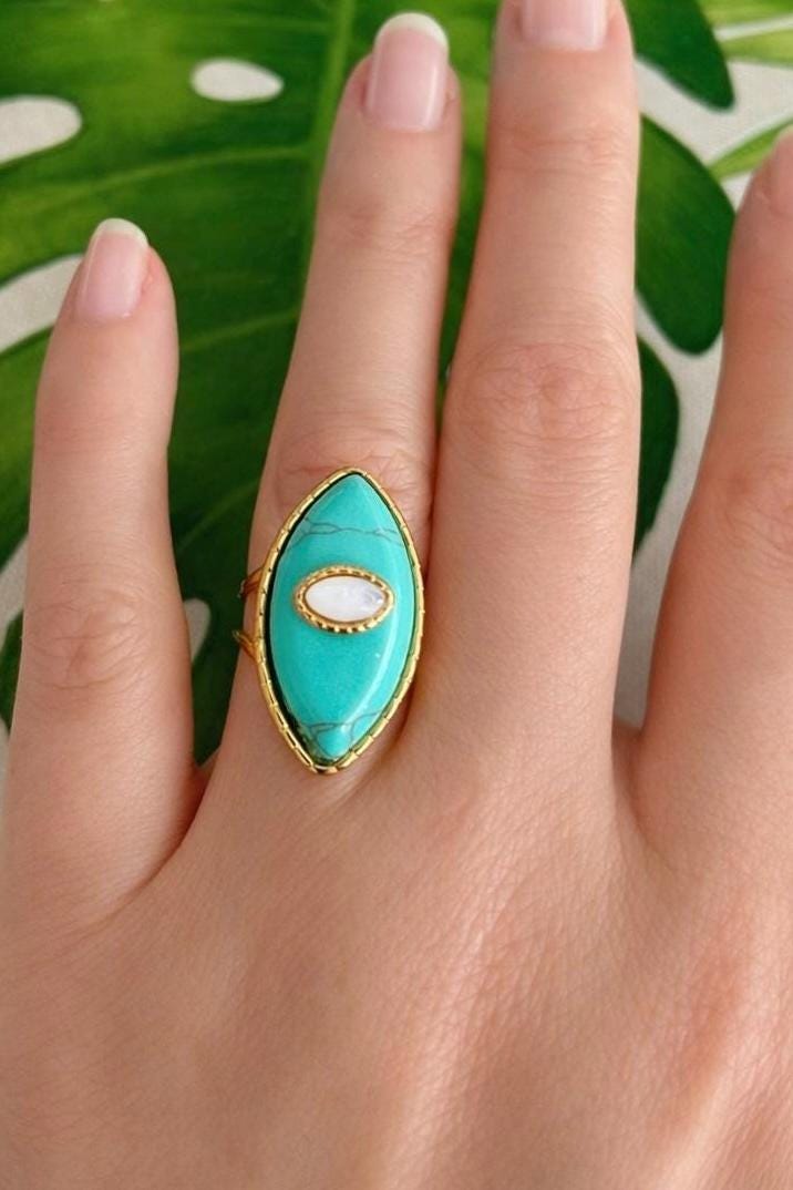 Stunning oval ring, boho chic style, high quality, featuring a natural stone: turquoise and mother-of-pearl, tiger's eye and turquoise, or jade and turquoise. It would make a beautiful gift for a birthday or a treat for yourself.